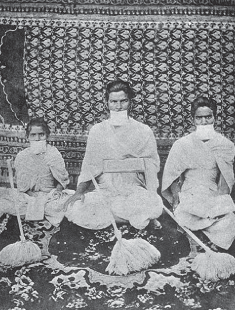 The Jagannath temple at Puri has a centuries-old annual ritual called Anasara. A few weeks before the annual Rath Yatra, the deities are bathed in 108 pots of cold water. They are believed to get fever after this ritual and are therefore quarantined for 14 days. The significant fact in this ritual is that the priests cover their mouths with a piece of cloth to avoid contaminating the sacred water, when they do the abhiśekam.