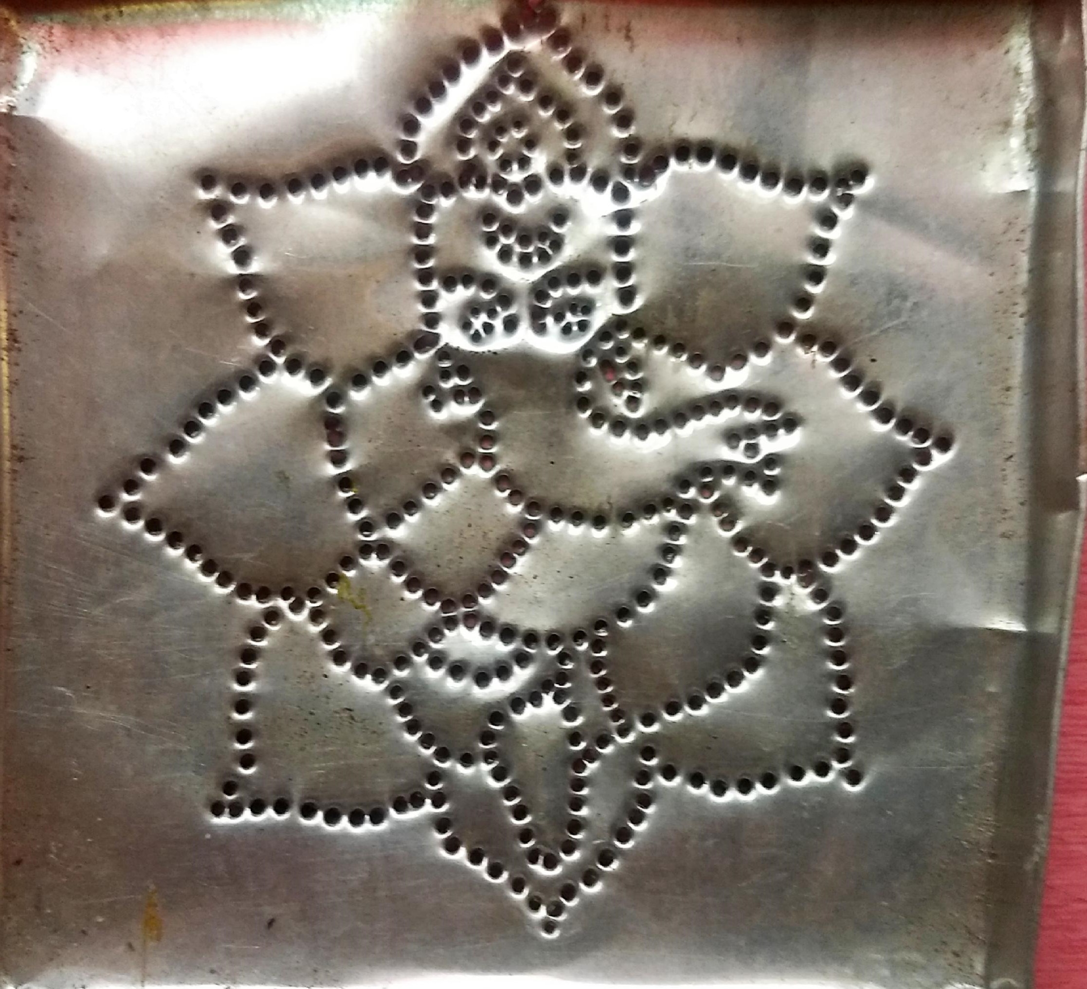 She continued making beautiful things till her 80s. One year she had made 108 (more, in fact) of these Ganpatis images on small squares of tin foil, painstakingly tracing the patterns on them and then piercing the outlines with a pin. They were carefully folded so that rangoli powder could be put on them and the Ganapati image imprinted! I only have one of them left, but there were many different Ganapatis she had made and given away with the haldi-kumkum on Vata Savitri vrat, after she completed 108 pradakshinas of the vata-vriksha! She taught youngsters a lot of handicrafts till a ripe old age.