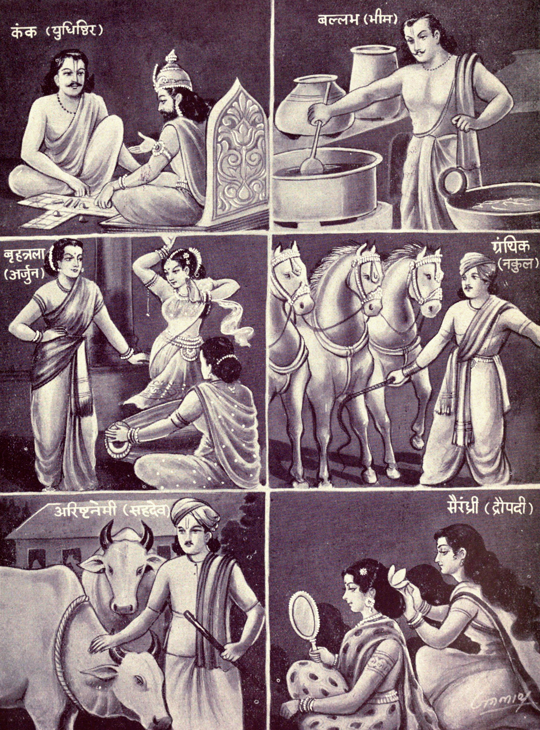 Pandavas who possessed higher qualities like respect to elders and acharyas, adherence to truth and compassion towards all living beings were not only active during the ajnatavasa but practiced the kshatriya dharma (क्षत्रिय धर्मं) while serving King Virata of Matsya in various capacities, helping the kingdom prosper. Yudhishtra, as the advisor to the king, Bheema as a cook, Arjuna disguised as a transgender teacher of fine arts to the queen, Nakula and Sahadeva as groom of horses and a cowherd respectively, did yeoman service to the king.